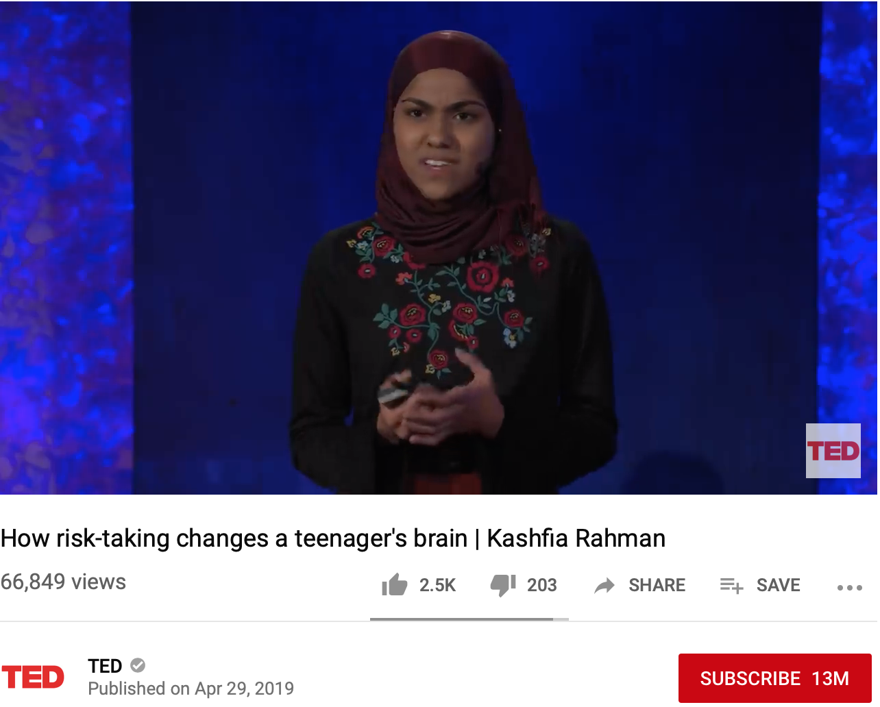 Kashfia Rahman came on TED Talk to share her research she’s done on how risk-taking changes teenagers brains. She stated “How can so many teens be so smart, skilled and responsible and careless risk-takers at the same time?” after she mentioned the online challenge of teens eating tide pods. So she began to wonder why teens take such big harmful risks. There has already been research done by neuroscientist that teenagers brains are still in the process of maturation and that is what makes them exceptionally poor cat decision making.