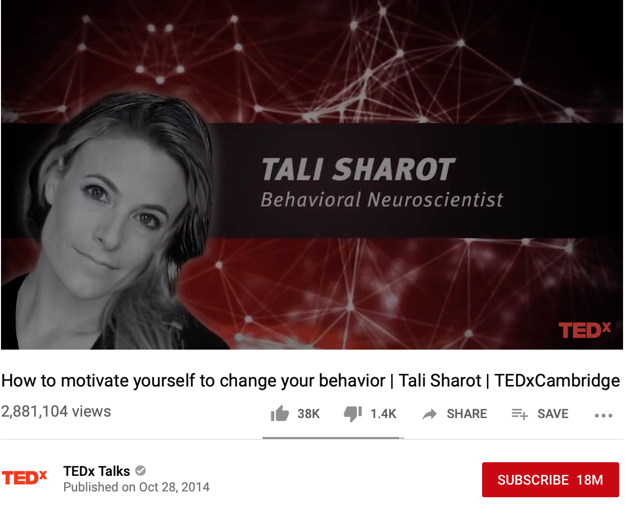 This next video I want to show you guys is how to motivate yourself to change your behavior. Tali Sharot talks about everyone has some behavior they would like to change about themselves and how we all want to help someone else change their behavior in a positive way.